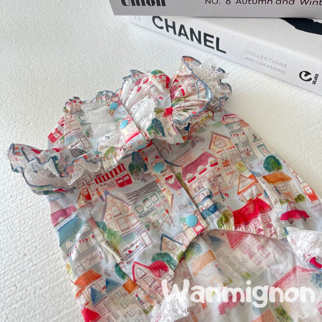 カラフルな北欧の街並みがプリントされた、おしゃれなワンピース